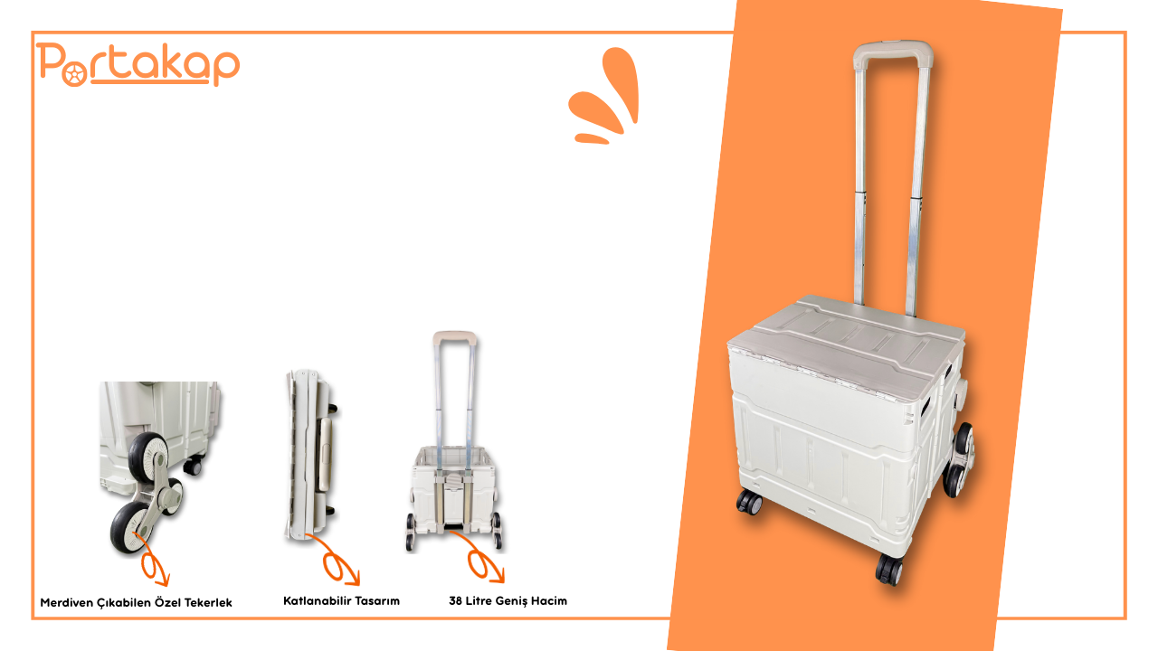 Portakap Piknik Masalı, 8 Tekerlekli, 55 Litre Beyaz ve Kahverengi Katlanır Alışveriş Arabası - Merdiven Çıkan