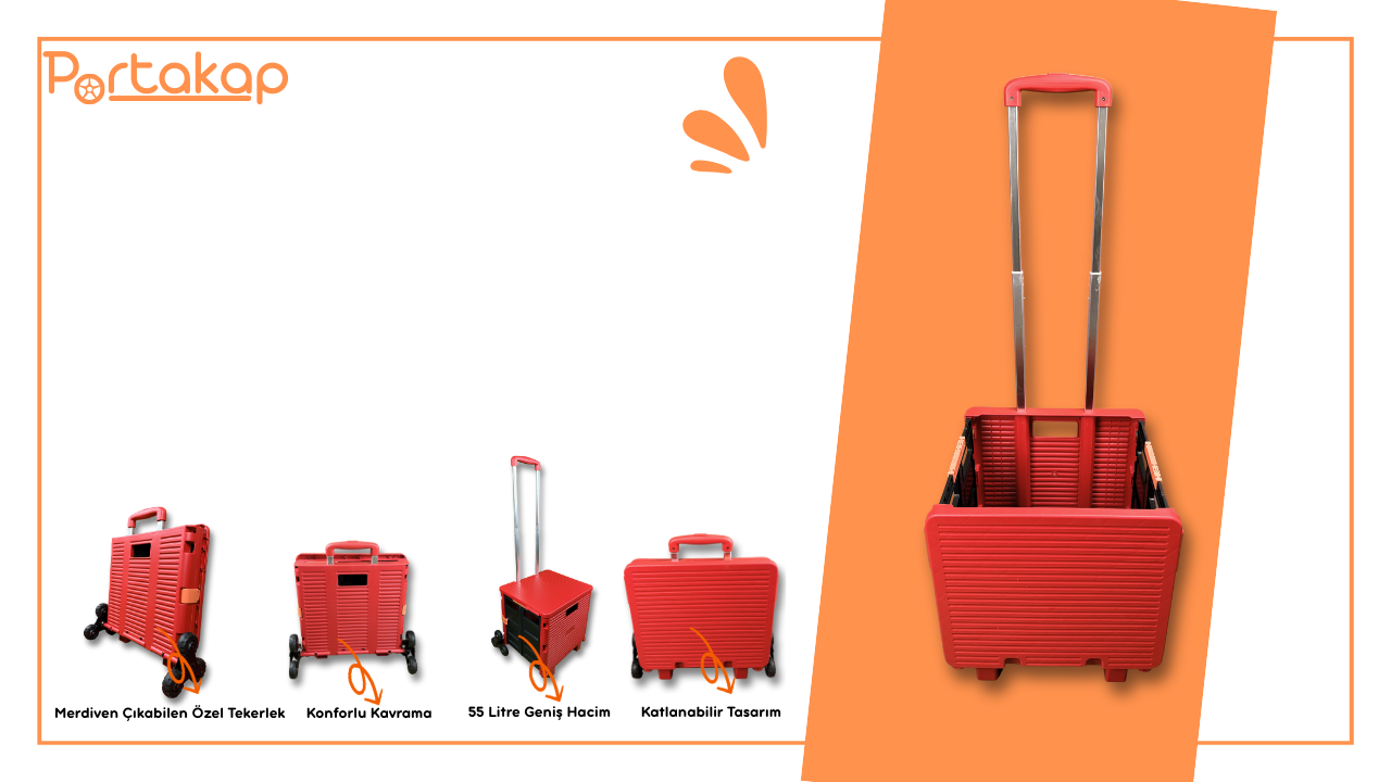 Portakap 4 Tekerlekli, 55 Litre Kırmızı Katlanır Alışveriş Arabası