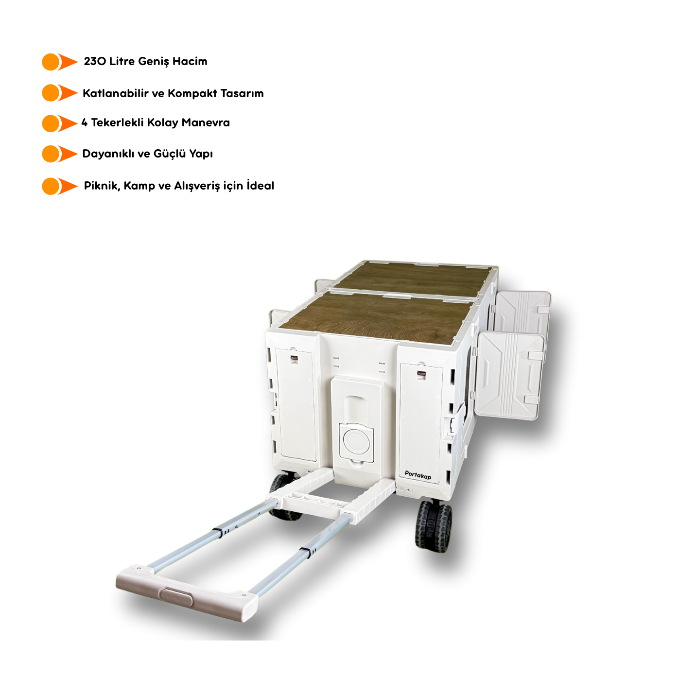 Portakap 230 litre kapasiteli 4 tekerlekli katlanır piknik arabası, geniş iç hacmi sayesinde piknik, kamp veya alışveriş ihtiyaçlarınızı kolayca karşılar. Dayanıklı yapısı ve katlanabilir tasarımıyla hem güçlü hem de taşınabilir. Kullanmadığınız zamanlarda yer kaplamadan saklanabilir.