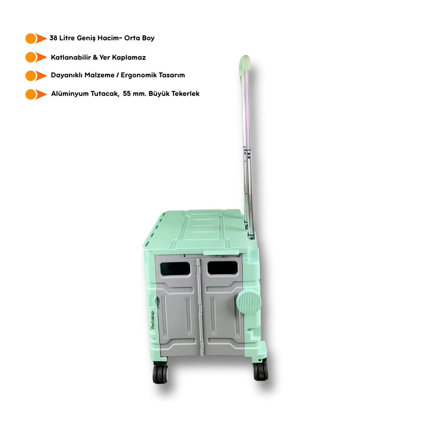 Konforlu ve Kullanışlı Taşıma Çözümü! Portakap 38 litrelik orta boy alışveriş arabası, dayanıklı hareketli alüminyum tutacak ve 55 mm büyük tekerlekleri ile rahat kullanım sağlar. Canlı yeşil rengiyle alışverişlerinize enerji katar.